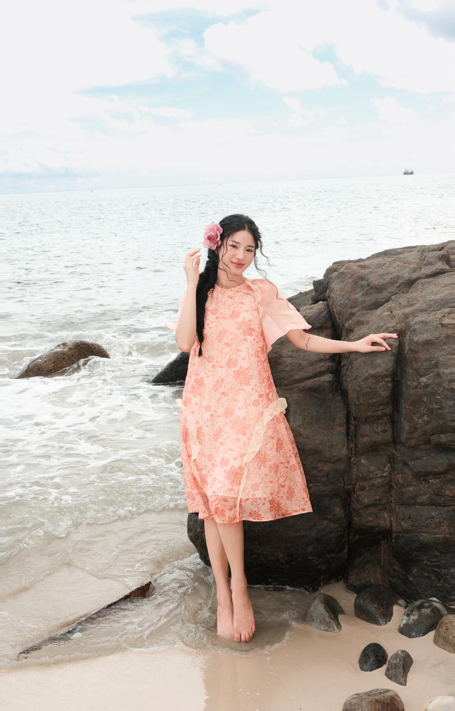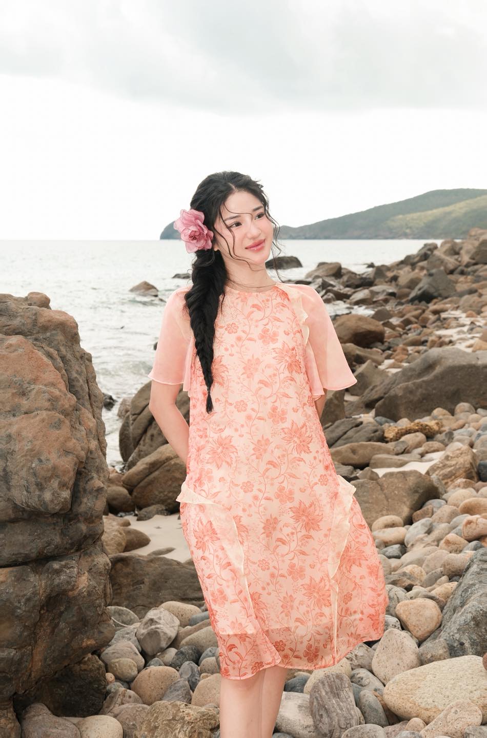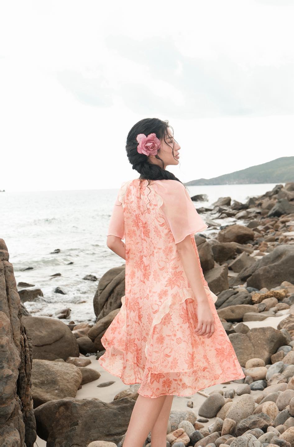Chiếc váy voan dáng dài với hoạ tiết hoa sắc hồng phai dịu dàng, là lời thì thầm đầy nữ tính giữa thiên nhiên hoang sơ và tiếng sóng vỗ an yên.