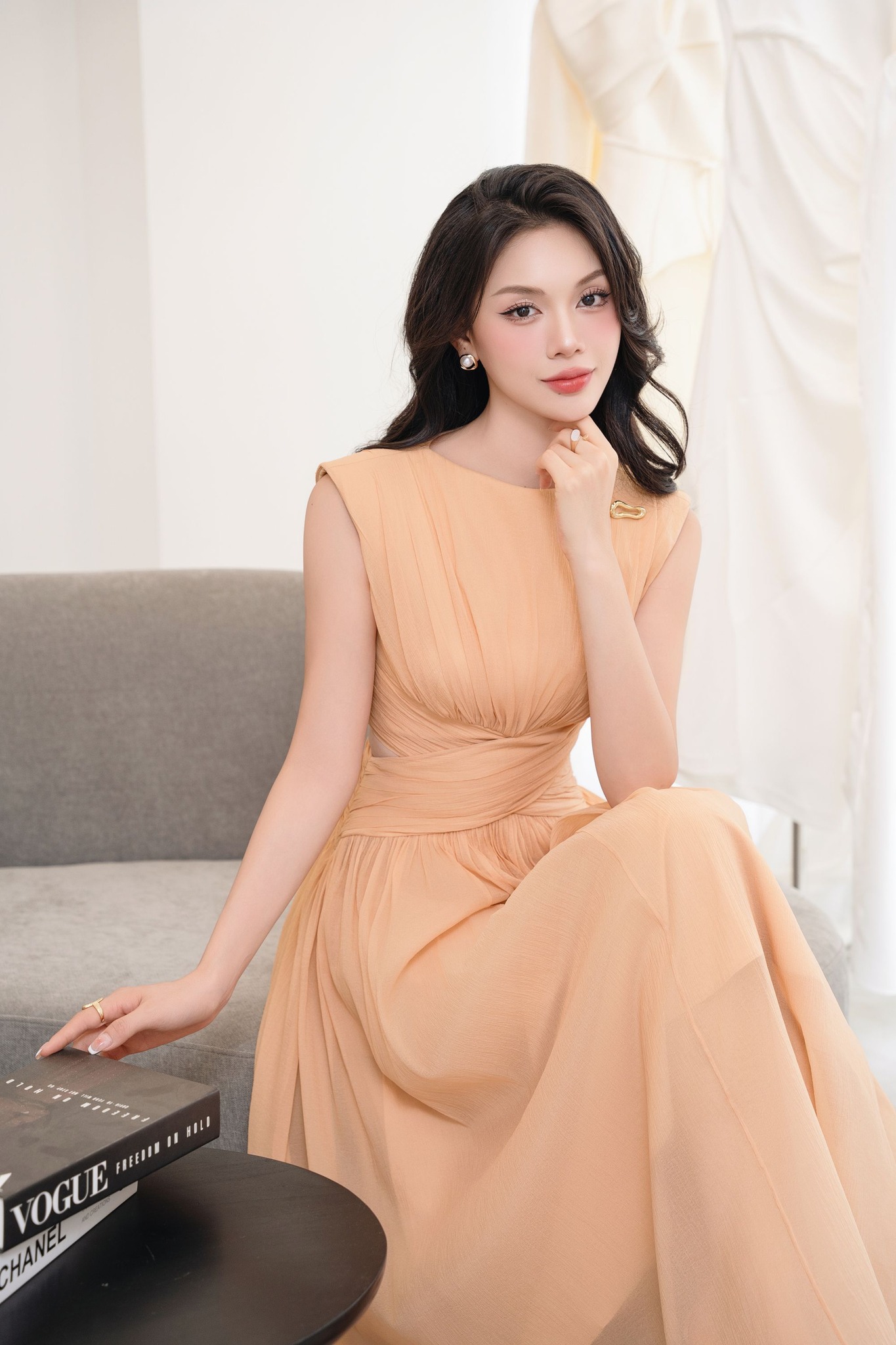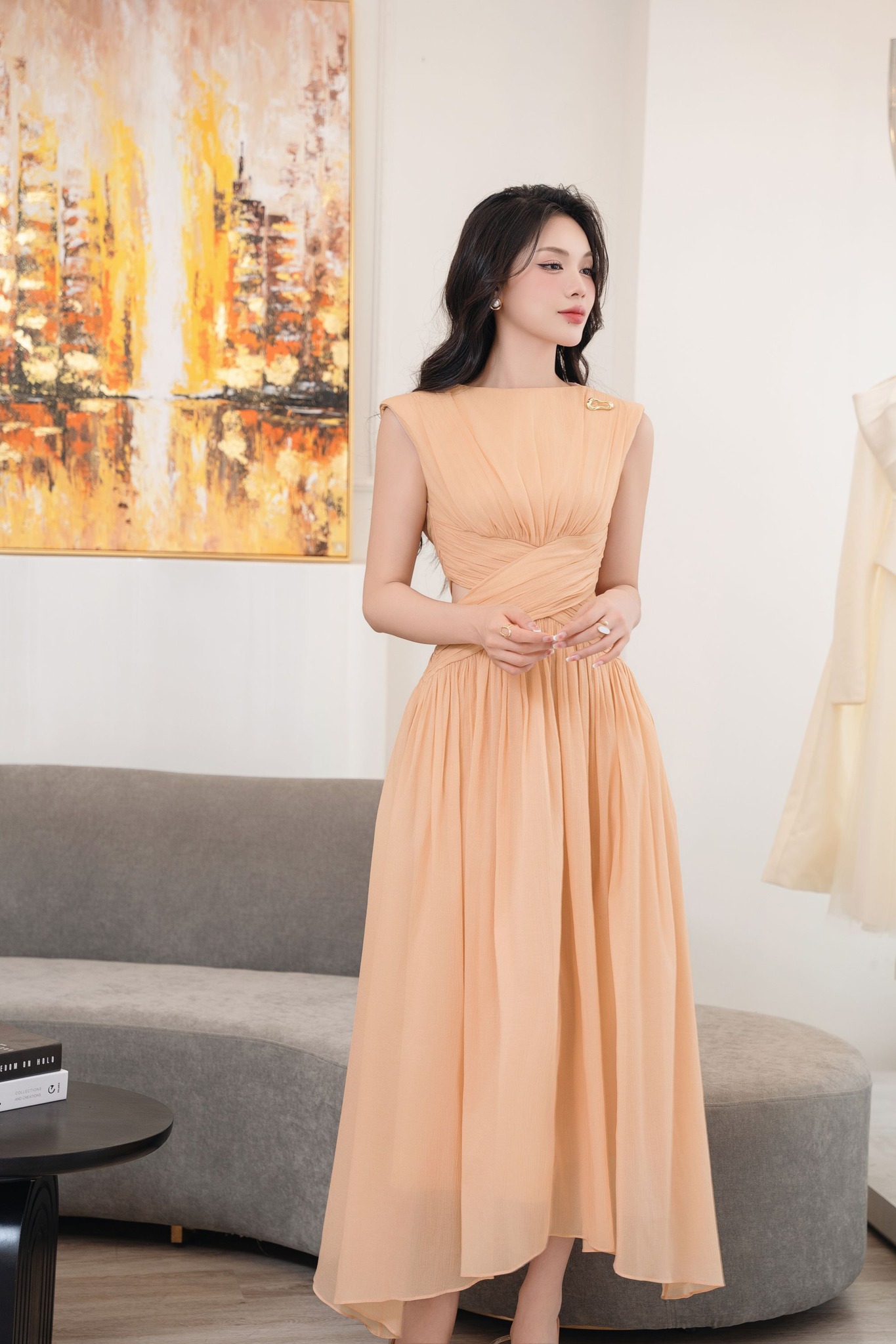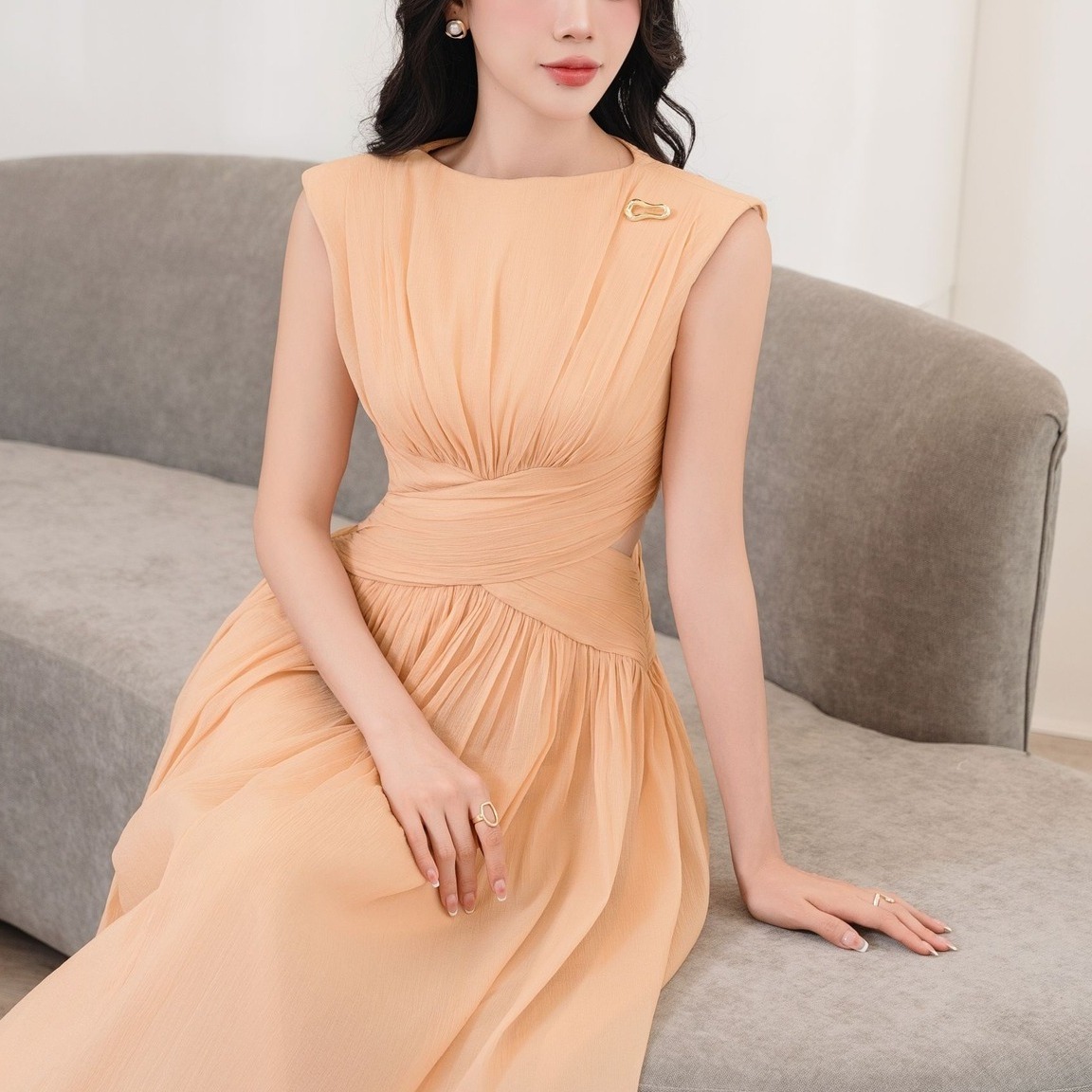 Từng đường draping cùng màu cam ánh nhẹ giúp cho thiết kế Sofia Dres toát lên vẻ nhẹ nhàng thanh lịch. Thiết kế là lựa chọn hoàn hảo dành cho những Quý cô mang trong mình tinh thần tối giản, yêu thích sự tinh tế và muốn tạo vẻ đẹp riêng trong từng khoảnh khắc.