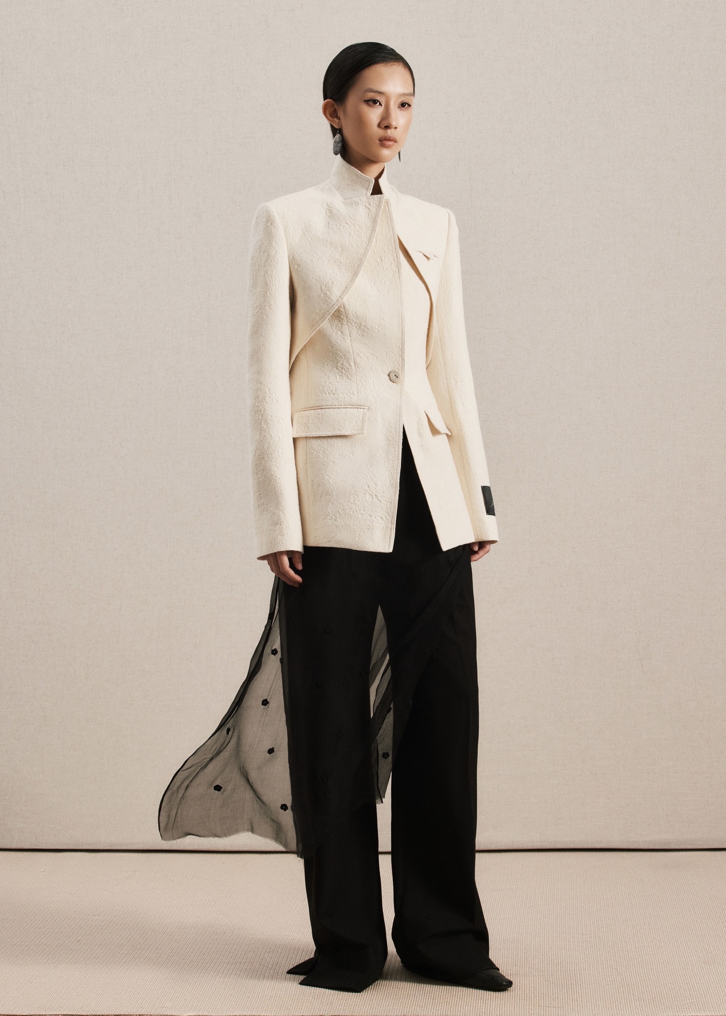 Trong sự tương phản giữa cảm giác mềm mại và đường cắt dứt khoát, chiếc blazer hé lộ vẻ đẹp của sự hài hoà – cảm xúc và hình khối giao thoa, hoà quyện, định hình sự tinh tế trong từng chi tiết.