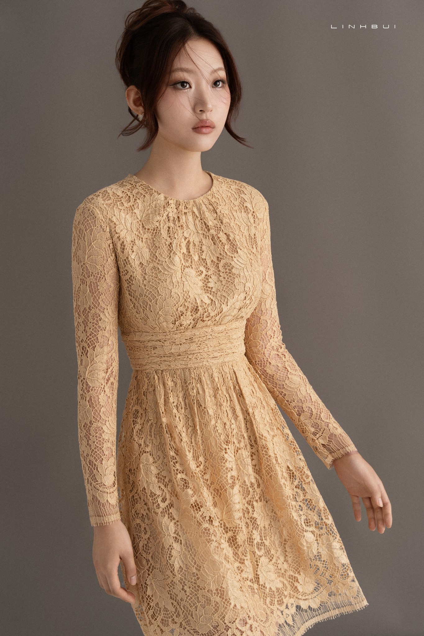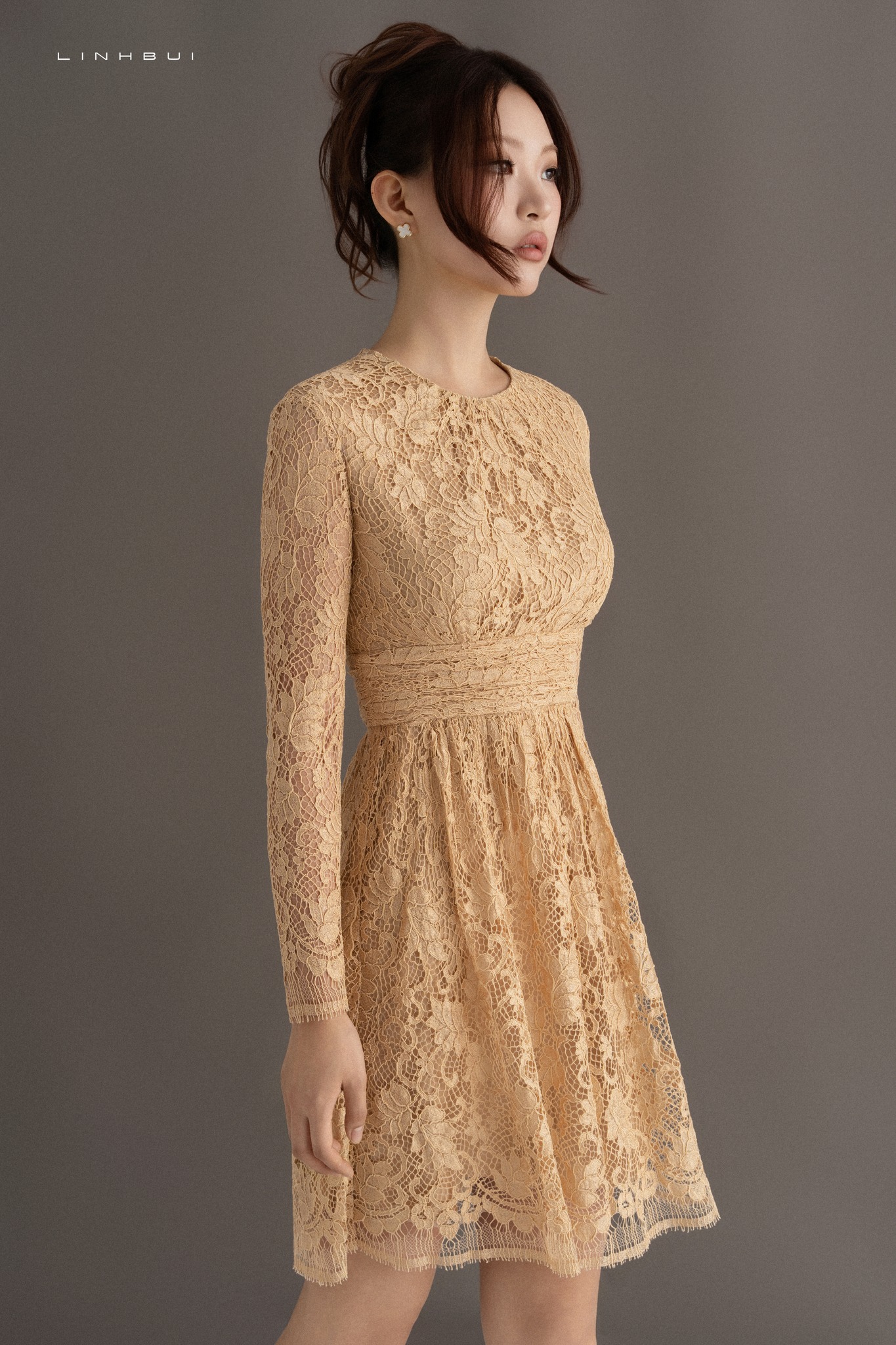 Hai thiết kế ren vàng mang hai sắc thái khác nhau của chất liệu ren mà LINH BUI luôn hướng tới.