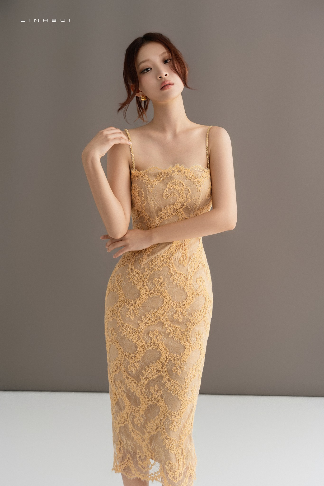 Chiếc váy tay dài với phần eo được xử lý tinh tế gợi nên vẻ chỉn chu, nền nã — đủ thanh lịch cho những ngày đi làm, nhưng vẫn yểu điệu và lãng mạn. Ngược lại, thiết kế đầm hai dây mang tinh thần hiện đại và phóng khoáng hơn, lý tưởng cho những buổi hẹn hò hay tiệc tối, khi ánh vàng của lớp ren trở nên cuốn hút dưới ánh đèn.