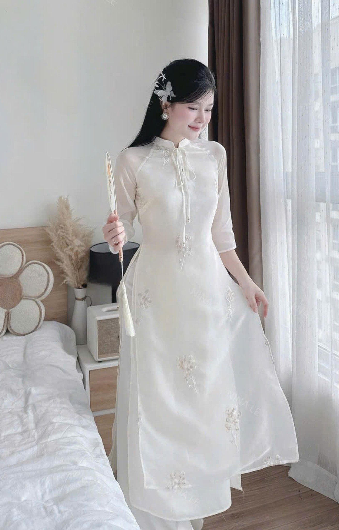 Set áo dài tơ thêu hoa – Nét duyên truyền thống pha chút hiện đại