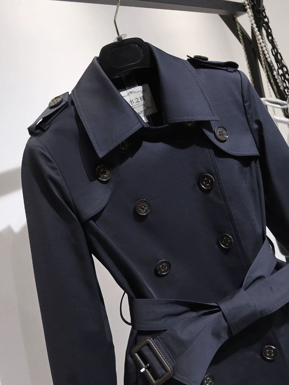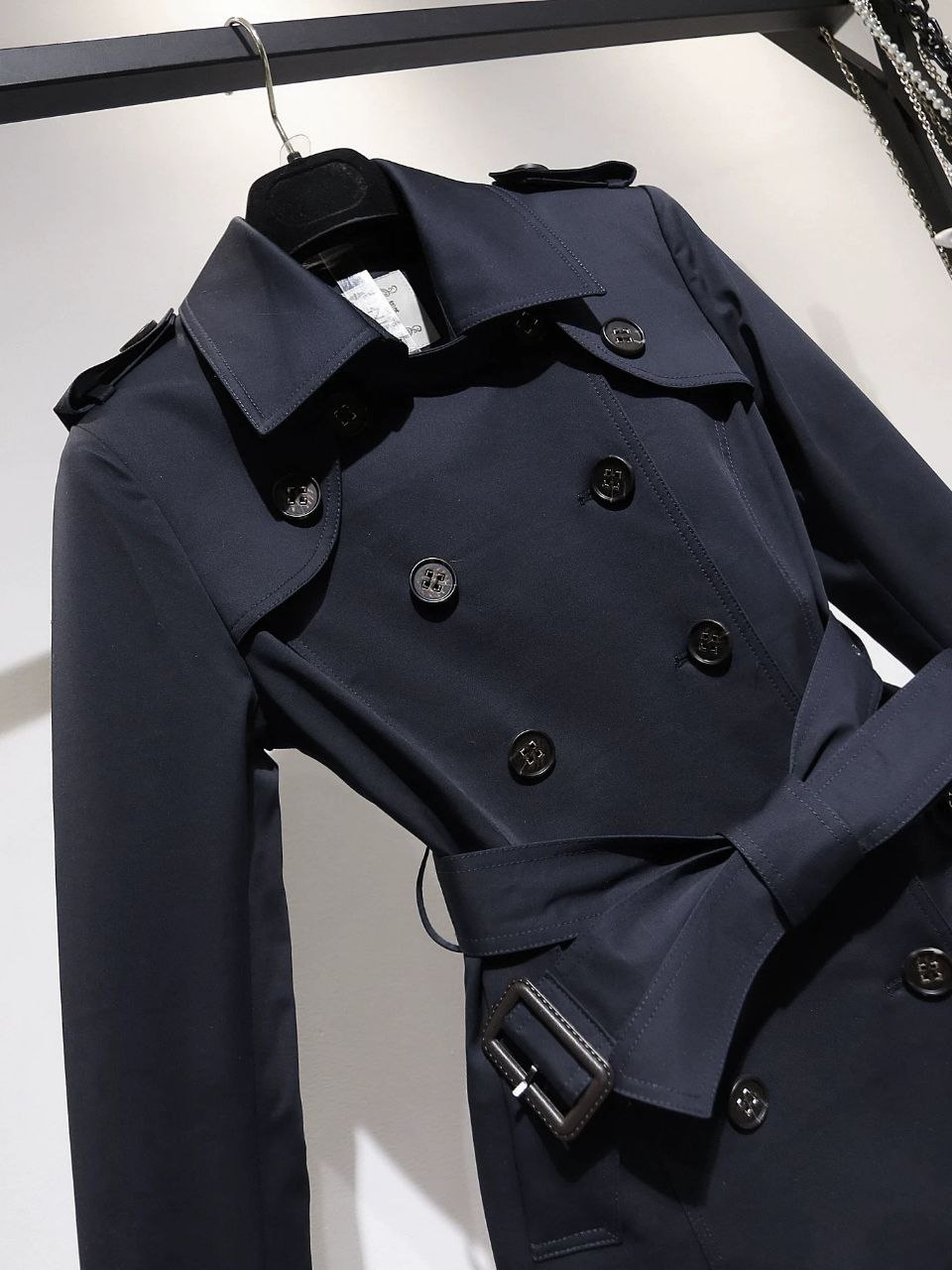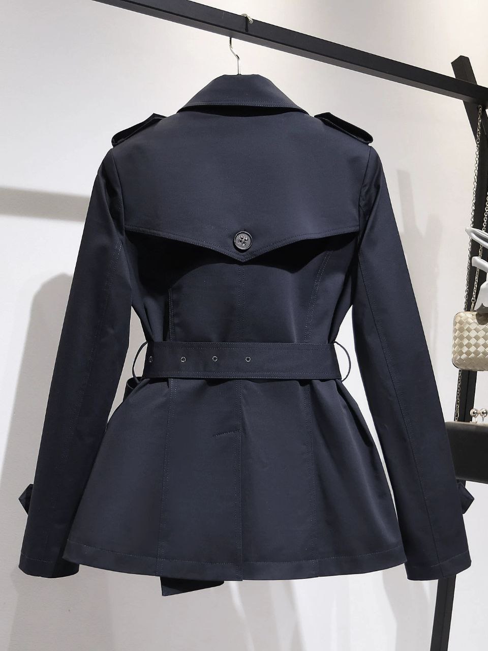 Áo măng tô dáng ngắn – thiết kế cổ điển với hàng khuy đôi và dây đai thắt eo tôn dáng, mang lại nét thời thượng mà vẫn giữ được sự tinh tế vốn có.