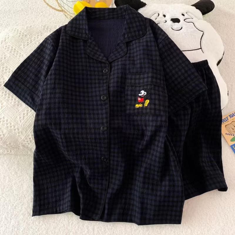 Bộ Ngủ Ngắn Kẻ Sọc Thêu Chuột Mickey Dáng Cổ Bẻ Chất Vải thun Cotton Mềm
