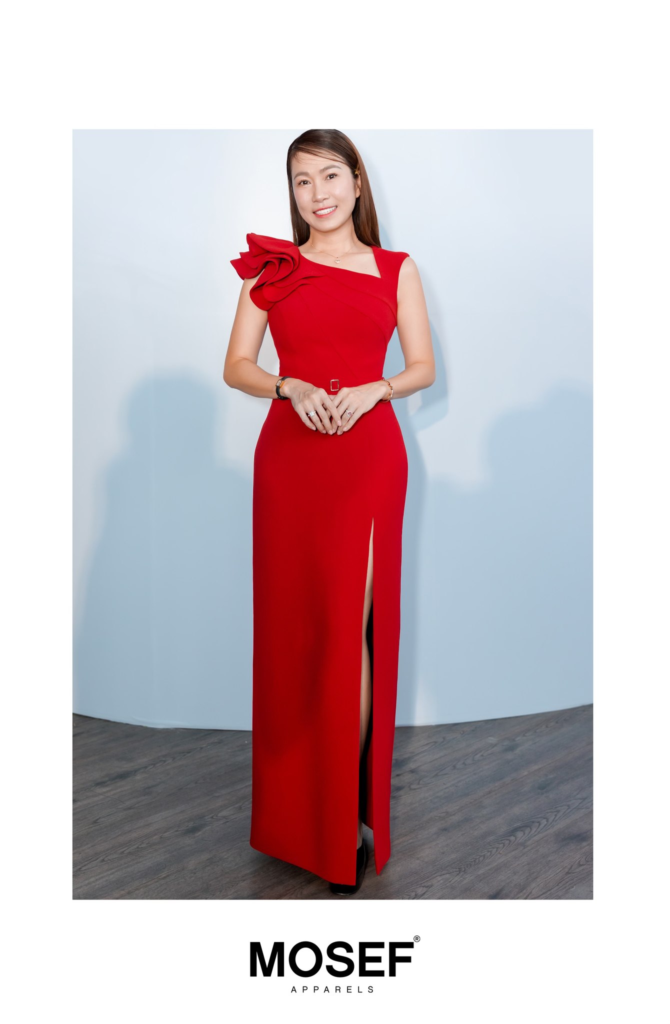 MC Thanh Thảo chọn diện thiết kế “Scarlet Poise” từ MOSEF – mẫu đầm với gam đỏ rufous cùng dỏm bất đối xứng, điểm nhấn ở phần vai xếp nếp mềm mại.