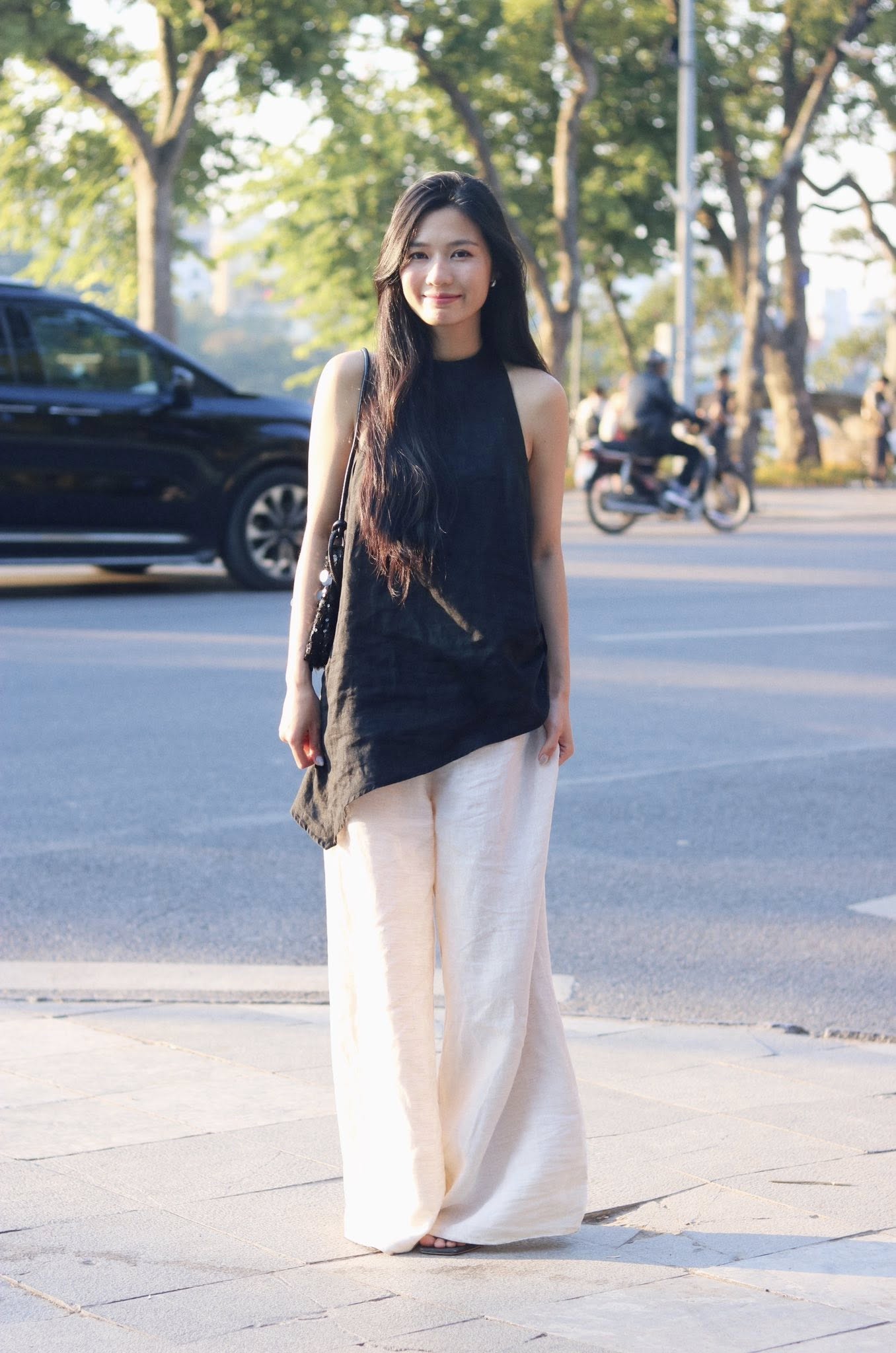 Rạng rỡ xuống phố với set áo yếm linen tà chéo tựa như chiếc lá bay nhẹ nhàng trong gió. Kết hợp cùng quần muối tiêu ống suông, mang lại sự thoải mái và dịu êm.