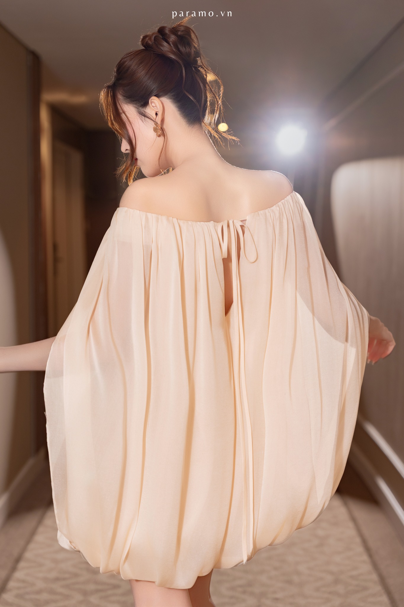 Daisy Dress – với thiết kế bubble hem tạo độ phồng nhẹ ở gấu váy, dáng trễ vai để lộ bờ vai, phần tay áo liền thân và rủ xuống như một lớp cape tạo sự thướt tha, ngọt ngào và tiểu thư. Kết hợp cùng chất liệu tơ sống nhũ cao cấp không nhăn và óng ả mang lại cảm giác mềm mại, thoải mái và thanh thoát cho người mặc. Điểm nhấn của váy là sợi dây đai cùng chất liệu và hoa cài thủ công càng làm thiết kế trở nên ấn tượng.