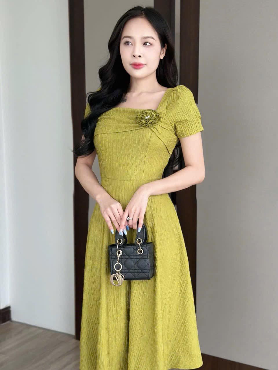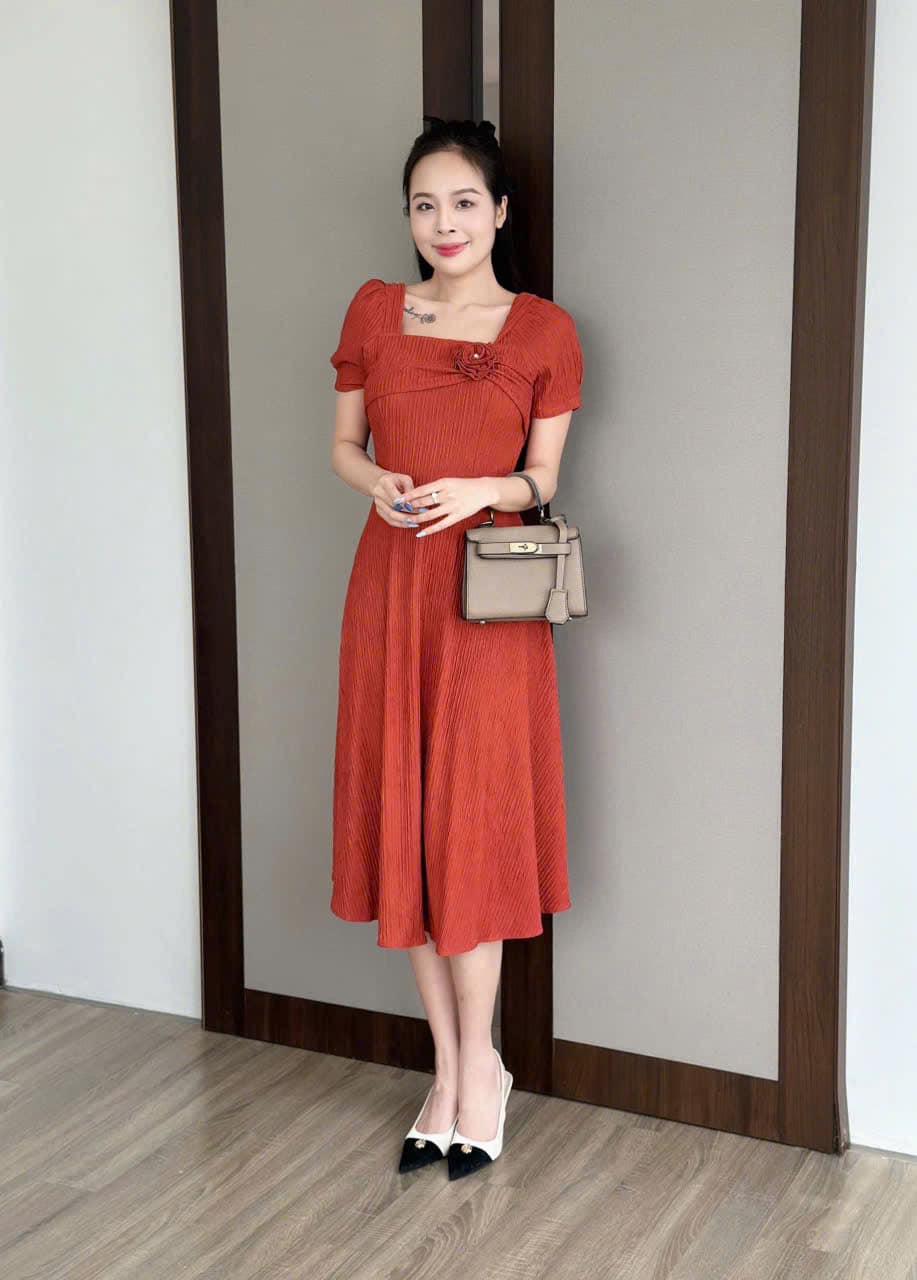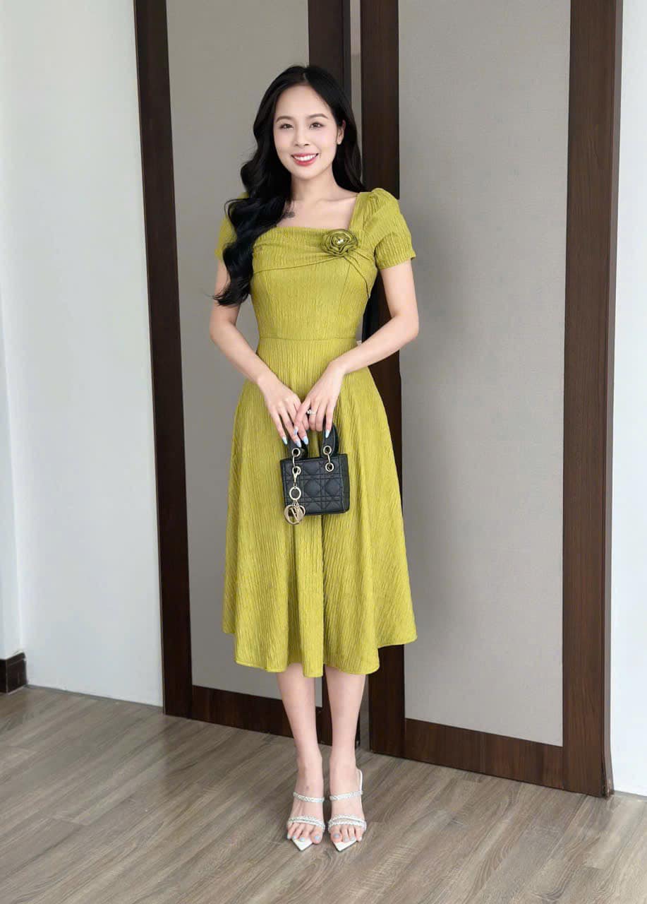 Đầm xòe thun xốp nhật co dãn, cổ vuông đính hoa kết ngọc, tay phồng