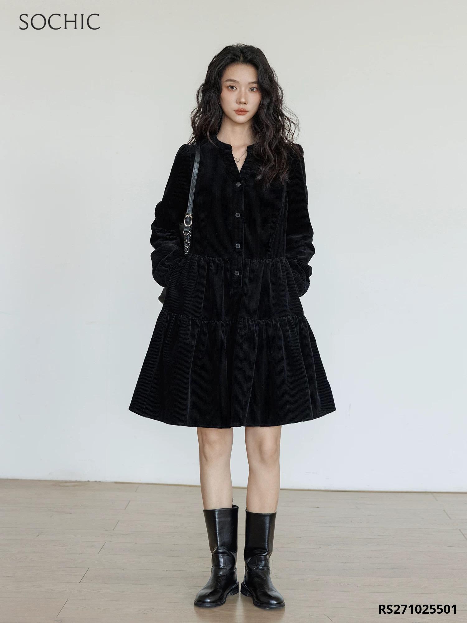 Mรด tแบฃ: Vรกy dรกng A xรฒe, cแป trรฒn xแบป V, tay dร i dรบm phแปng, khuy cร i, can eo rรบt nhรบn tรนng vรกy tแบงng xรฒe.