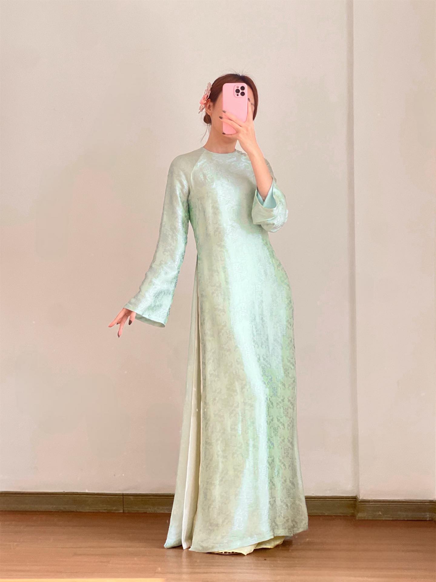 Thân áo dài gần chạm đất, mềm và rủ, tạo nên một cảm giác rất Tết: chậm, đầy, và có chiều sâu.