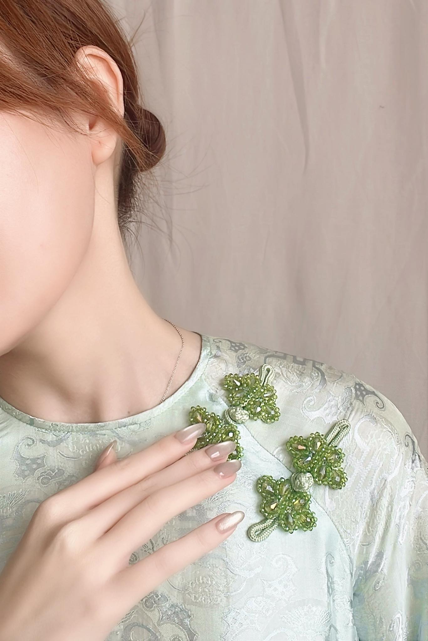 Những chiếc cúc đính đá xanh trên vai không phải để lấp lánh, mà để nhắc rằng: người phụ nữ này đã biết trân trọng từng chi tiết nhỏ của chính mình.