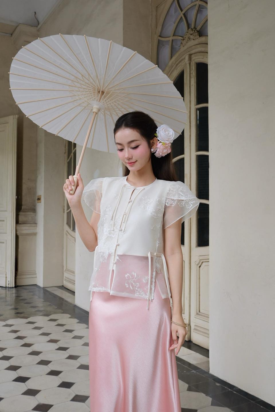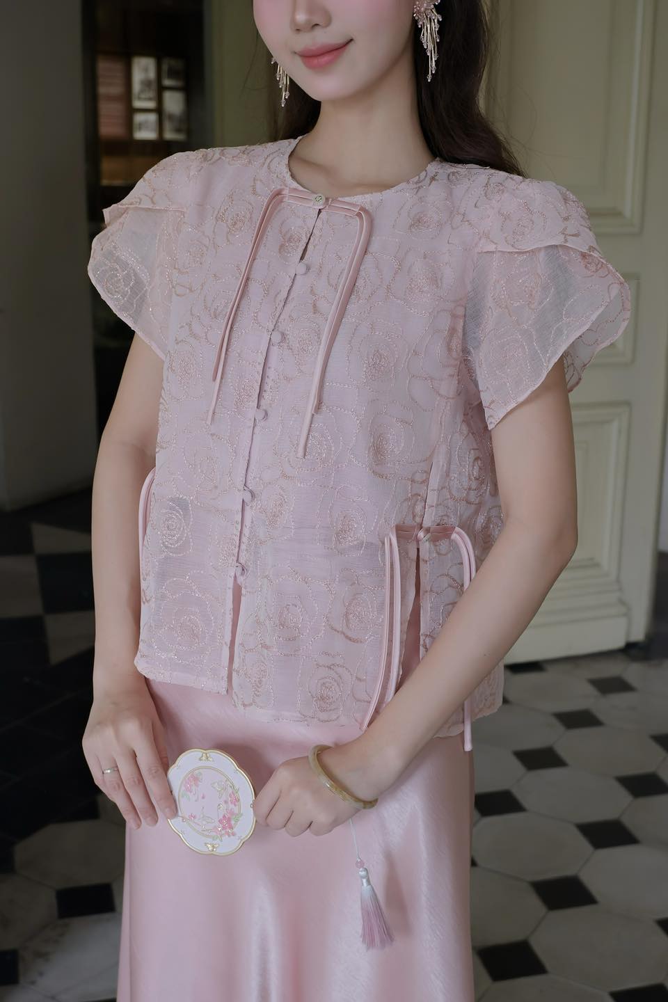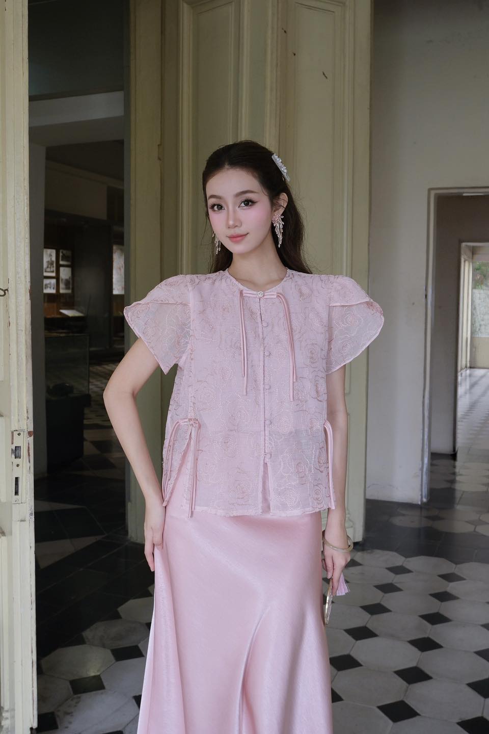 – Thân áo phối tơ hồng thêu hoa hồng mềm mại, nổi bật nhưng không hề sến