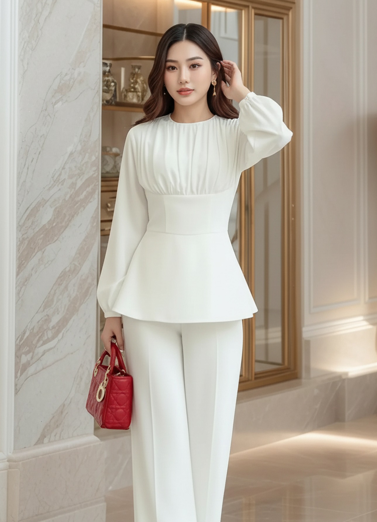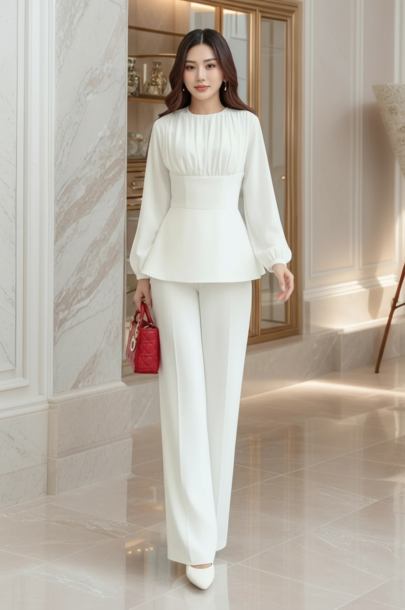 Set đồ thanh lịch với thiết kế hiện đại và đầy tinh tế, tôn trọn vẻ đẹp nhẹ nhàng và sang trọng cho người mặc. Áo dáng peplum với phần thân trên xếp ly mềm mại kết hợp tay dài bay nhẹ giúp tổng thể vừa kín đáo vừa nữ tính. Quần suông đứng form, đường cắt gọn gàng, mang lại cảm giác cao ráo và thanh thoát. Một lựa chọn hoàn hảo cho cô nàng yêu phong cách thanh lịch, tinh tế nhưng vẫn nổi bật theo cách rất riêng