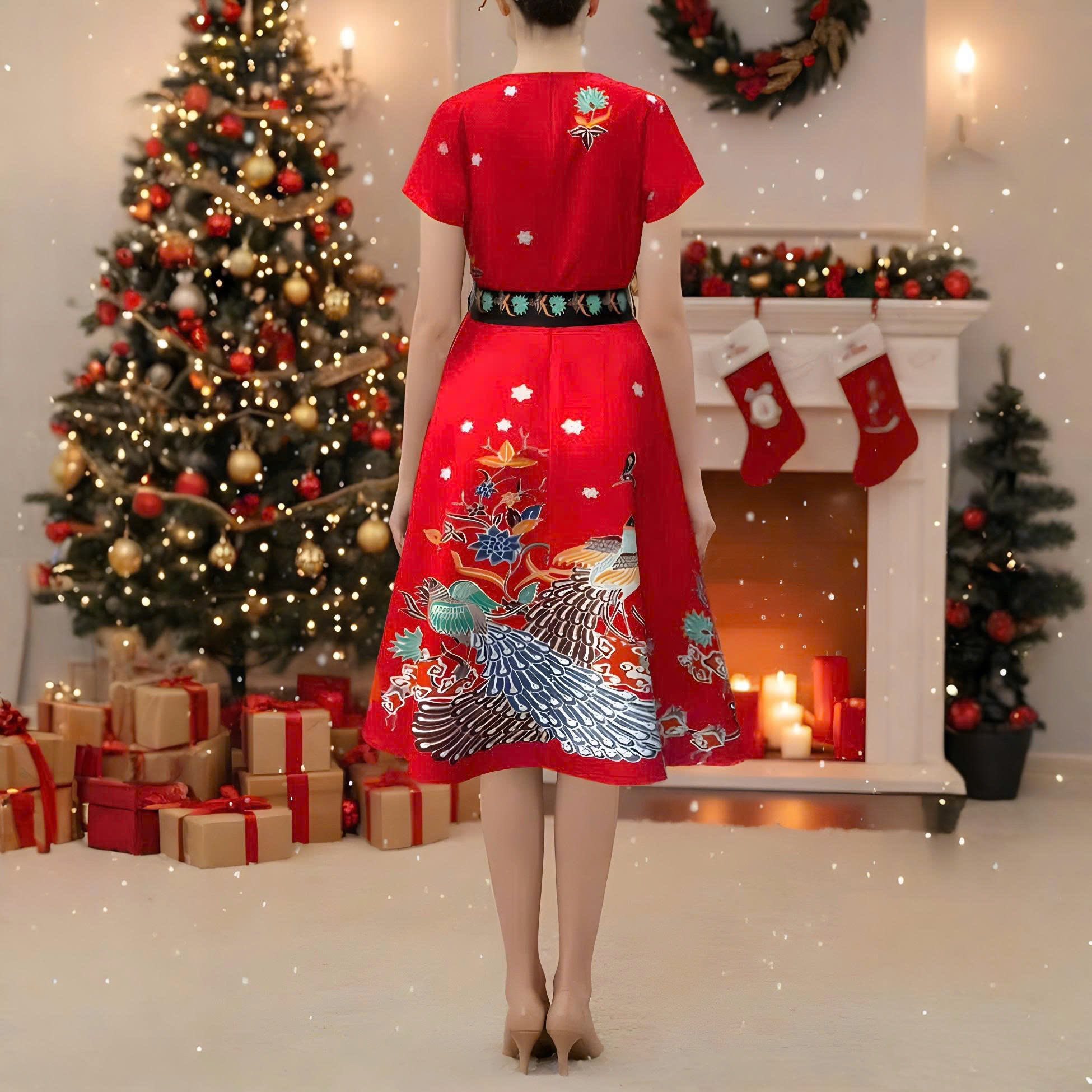 Chiếc đầm midi dáng xòe A, nổi bật mùa lễ hội có màu rực rỡ, tay áo ngắn, rất phù hợp không khí các dịp tiệc cuối năm. Chiết e , shares-0✔️ , likes-9️️ , date-2025-12-19 16:39:15📰🆕