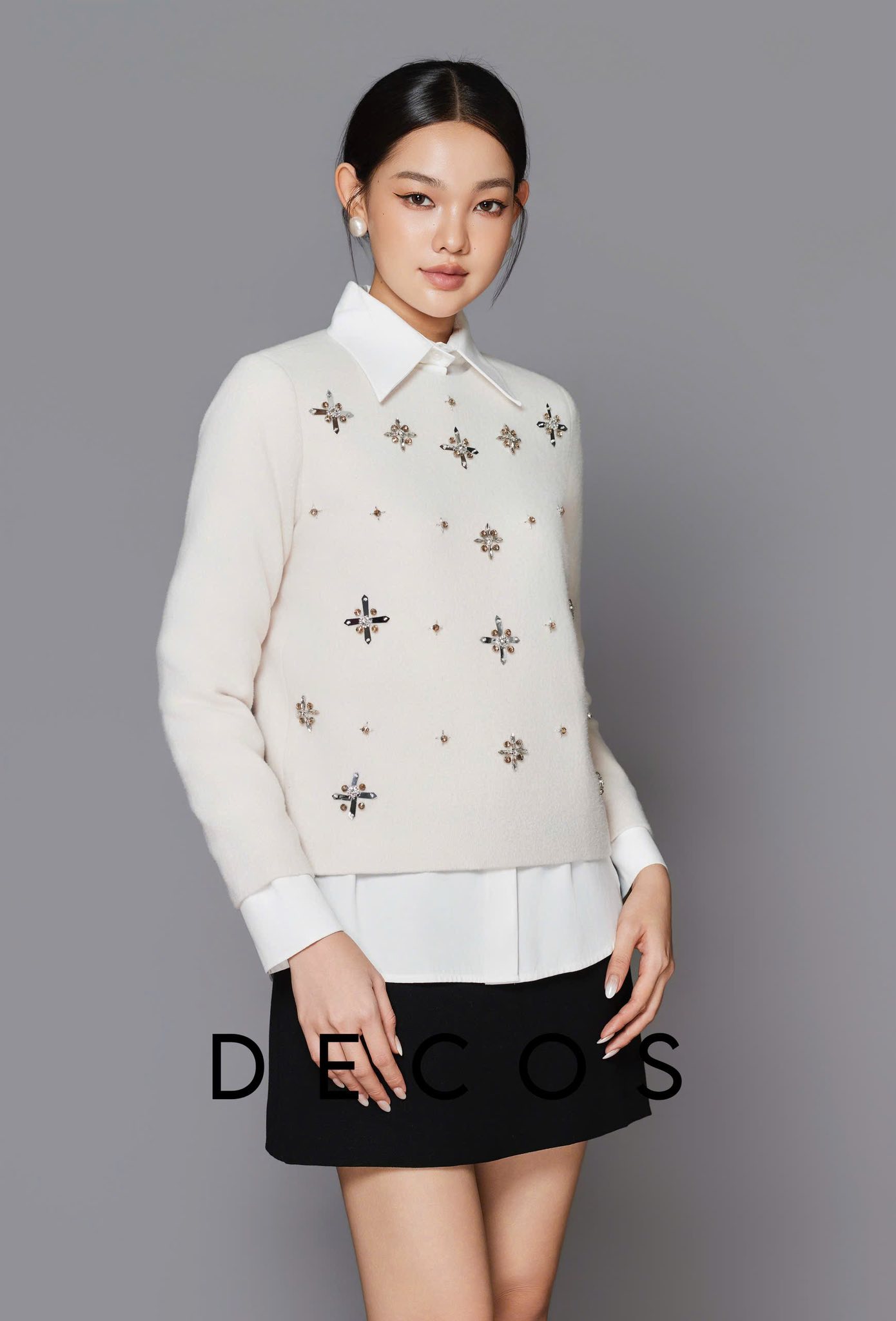 Áo ghi li hồng phấn đính kết cầu kỳ phối cùng sơ mi cơ bản và chân váy nhung đỏ đô phù hợp xuống phố cuối năm. Set đồ cực kỳ năng động nhưng không kém phần thanh lịch và nữ tính từ Decos. Chương trình áp dụng cho cả phiên bản màu đen và kem