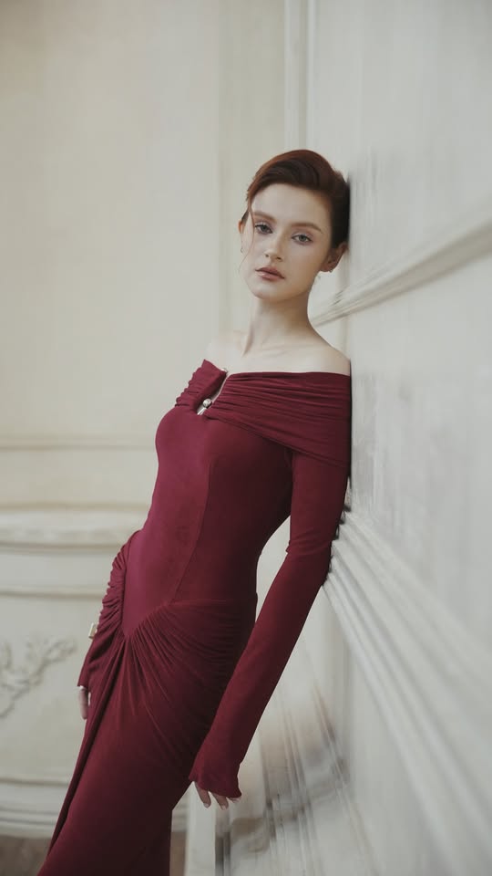 Soft shoulders, a sculpted waist, and a rich burgundy hue inspired by Parisian evenings.