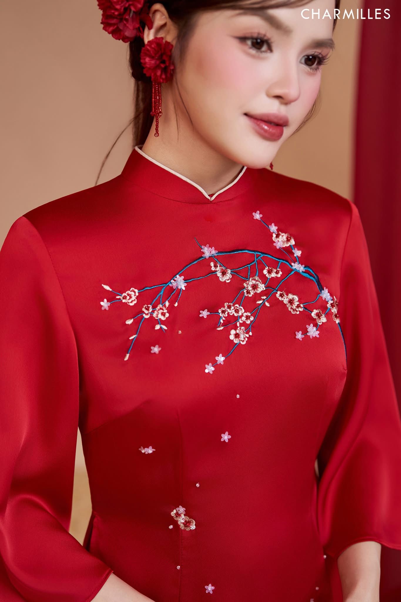 ❤️ Trên nền thước lụa cao cấp, sắc đỏ rực rỡ và nồng nàn như chu sa, cành đào thắm thêu tay tỏ mỉ gói trọn cả phong vị mùa xuân vào tà áo tạo nên một tổng thể vừa vặn, nữ tính và điểm xuyến nét kiêu kỳ.