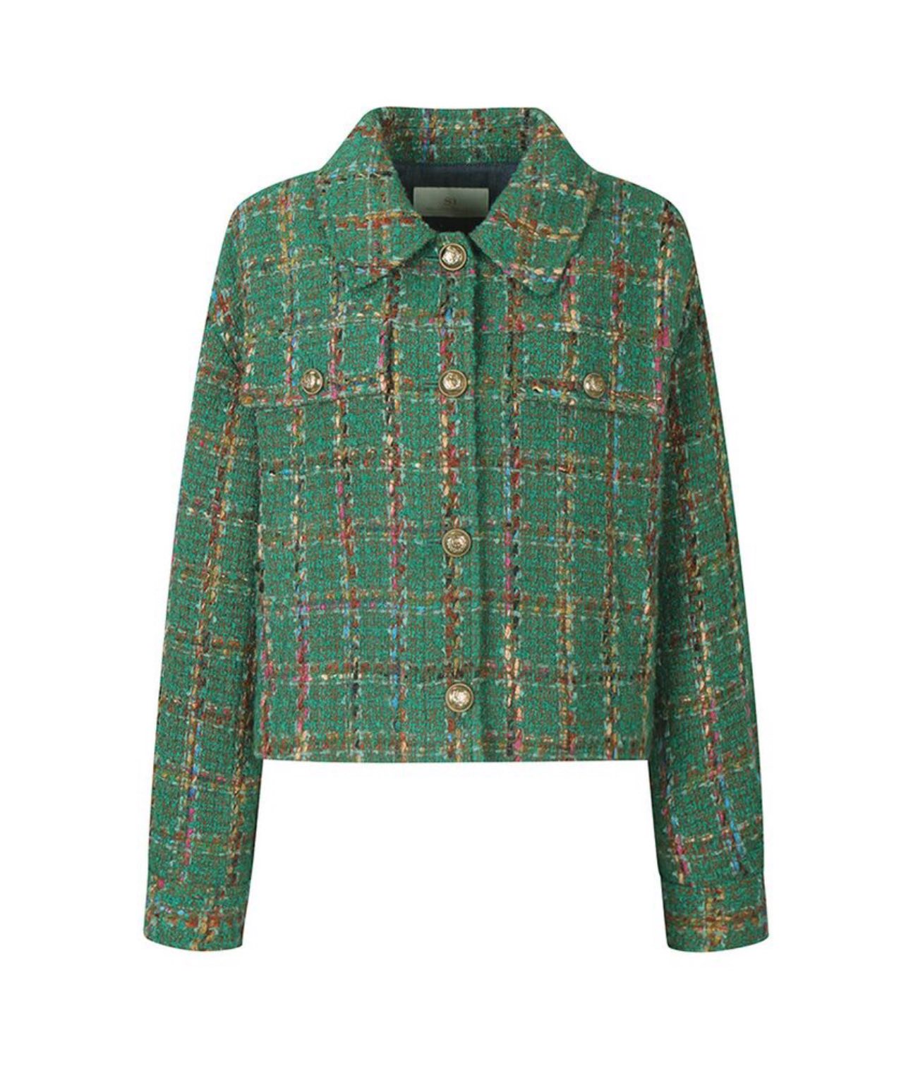 • Tweed dệt đa sợi với nền xanh emerald pha sợi ánh màu (blue – gold – burgundy) tạo hiệu ứng chiều sâu thị giác.