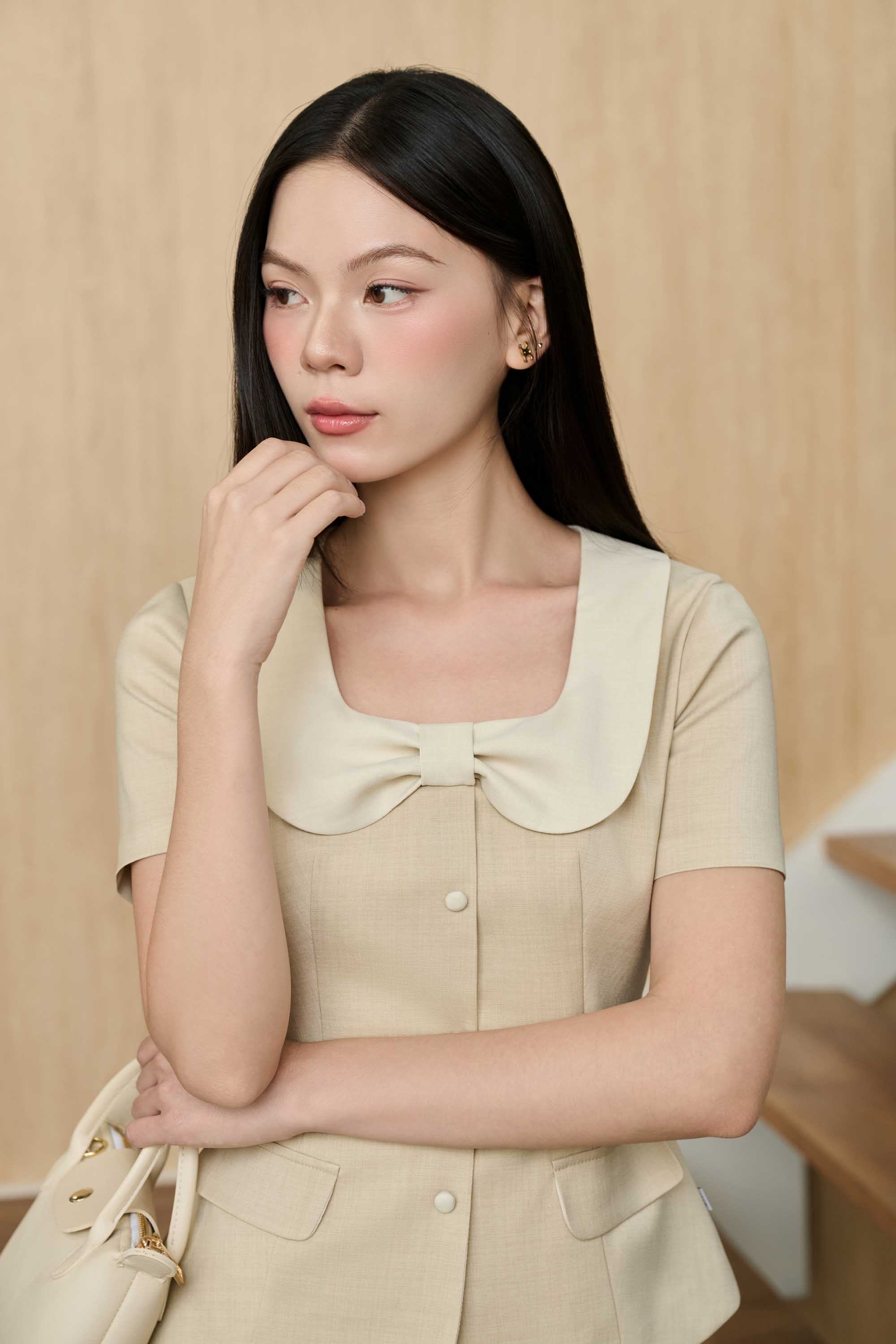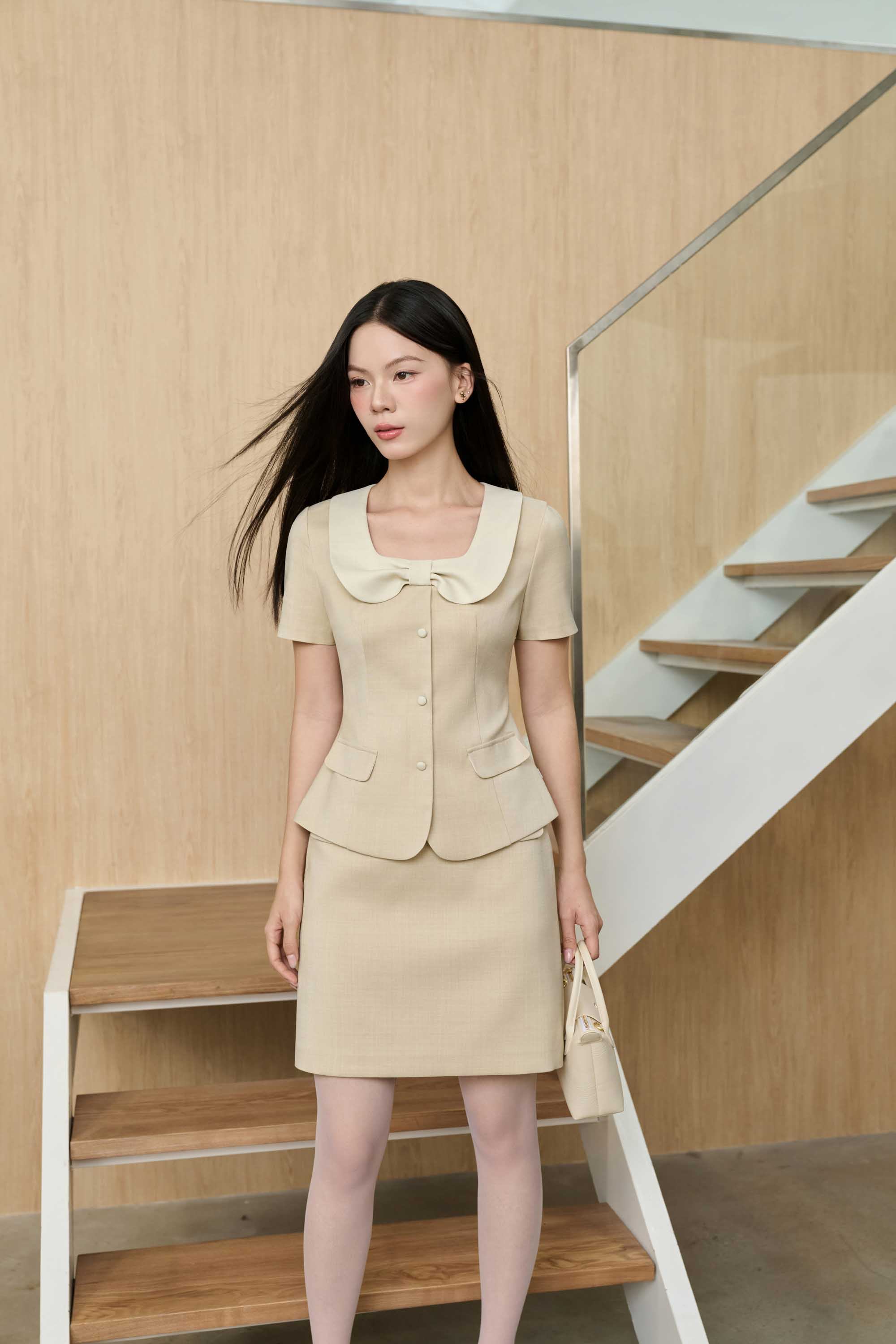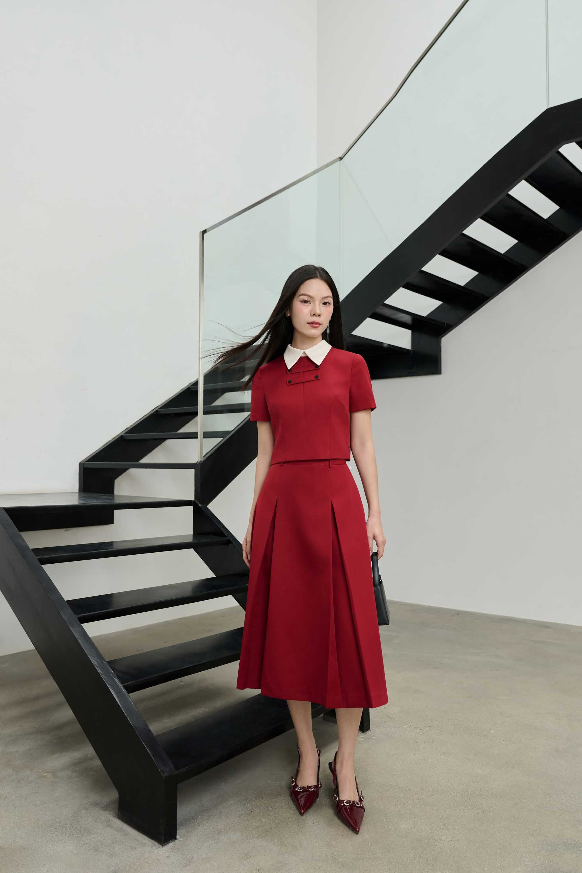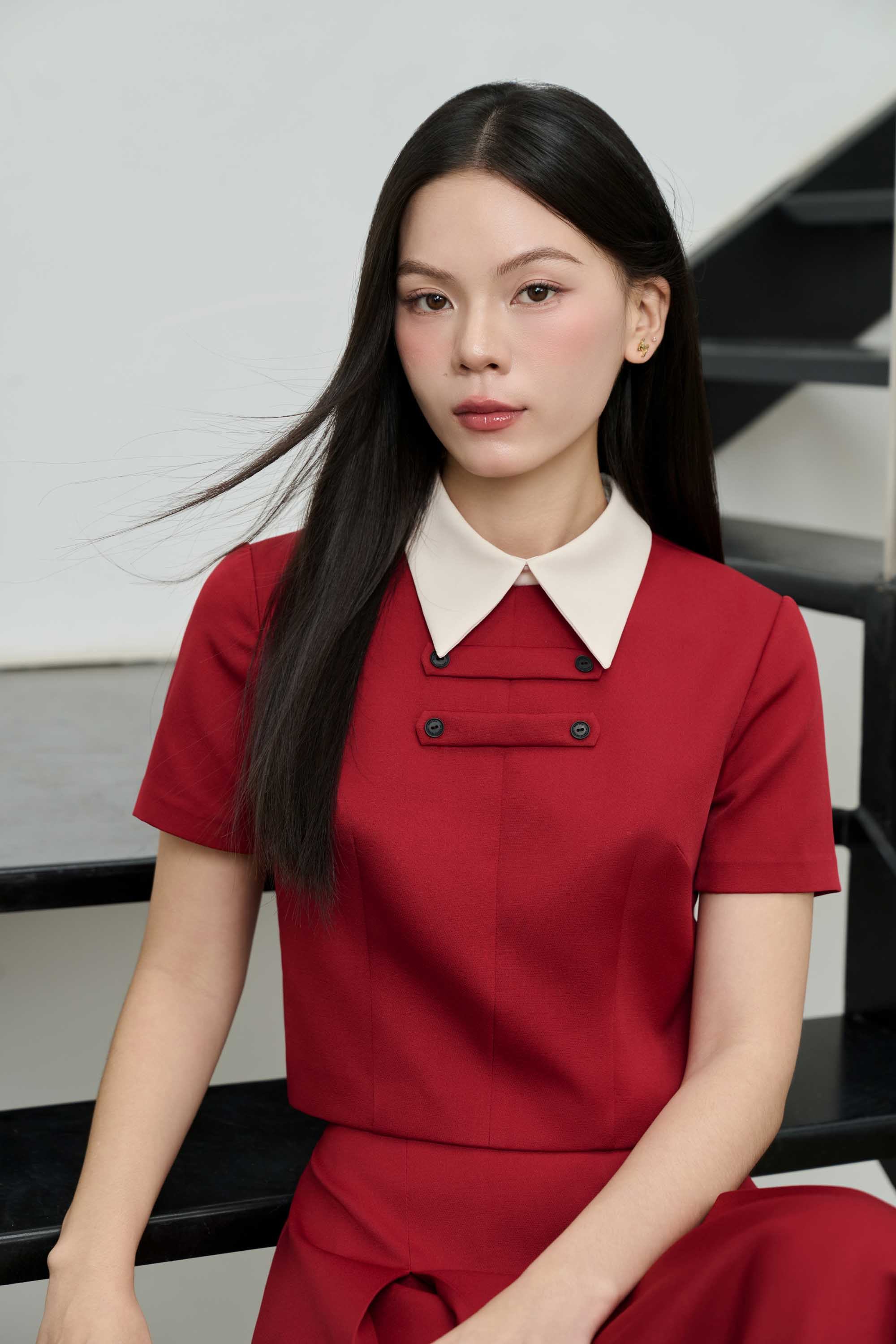 BST tôn vinh vẻ đẹp tối giản và chiều sâu cá nhân qua từng đường cắt tinh tế và các chi tiết nhỏ được tiết chế tinh tế đủ để tạo nên điểm nhấn nhưng không phá vỡ tổng thể thanh lịch. Gam trung tính từ beige, ghi lạnh đến nâu ấm, tạo nên nền thẩm mỹ thanh lịch và cân bằng. Đan xen giữa những sắc độ dịu mắt ấy là những thiết kế mang sắc đỏ burgundy – điểm nhấn thị giác khơi dậy năng lượng bản lĩnh, đam mê và sức hút nữ tính đương đại.