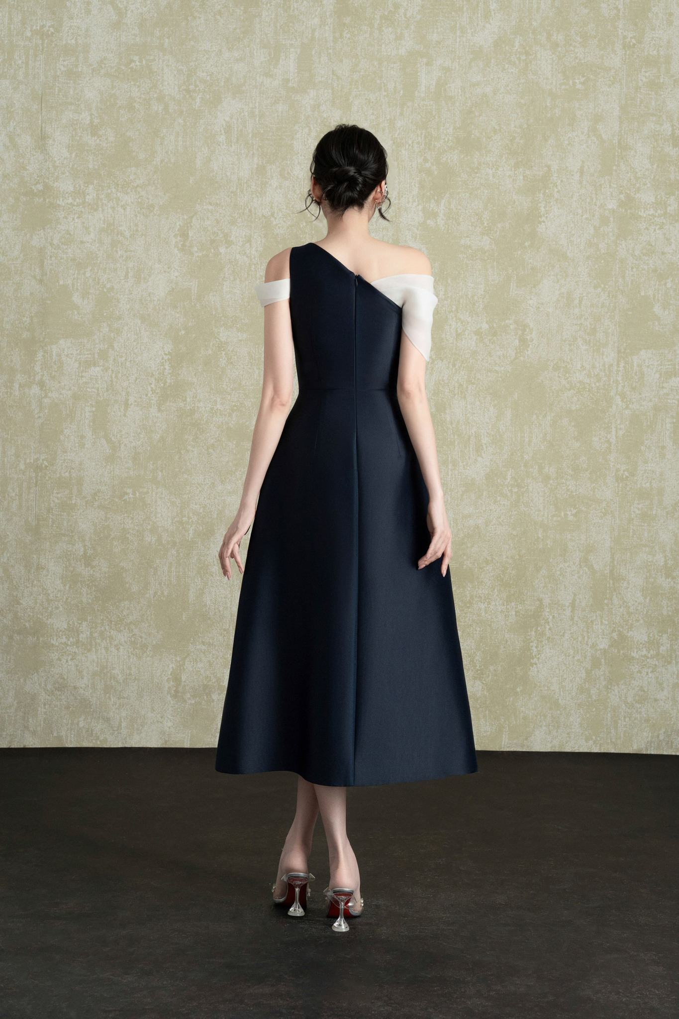 Thiết kế váy lệch vai ôm nhấn nha điểm xoè nhẹ thân eo xuống tạo nên sự cân bằng giữa sự kiêu kì và thanh lịch để quý cô luôn tỏa sáng đầy sang trọng.